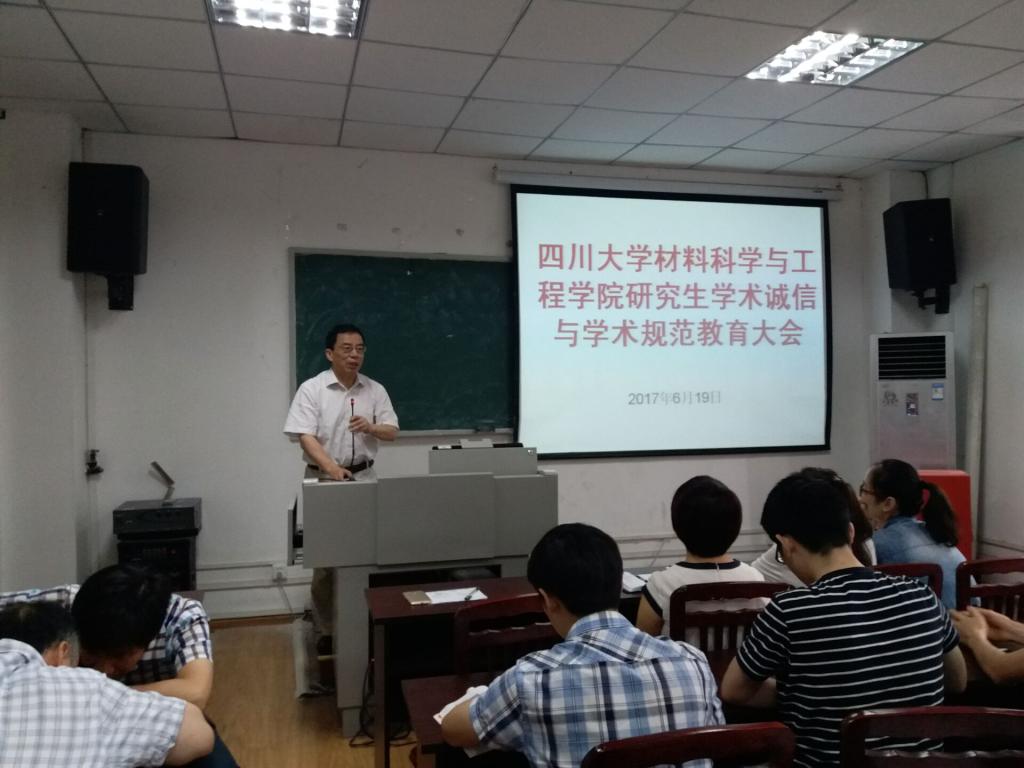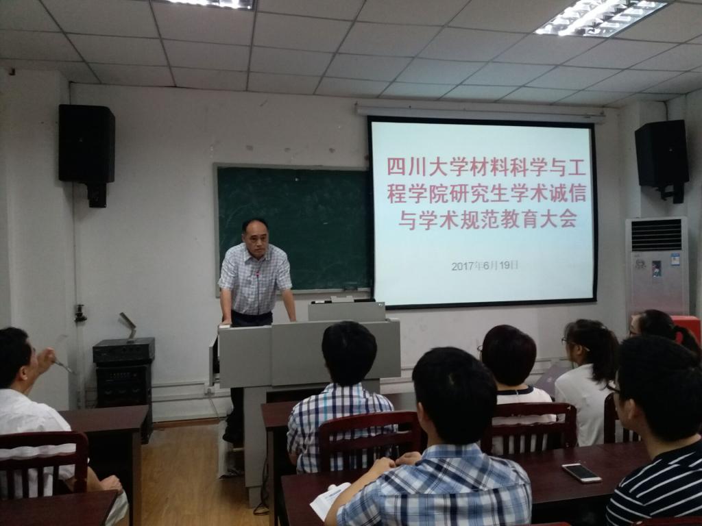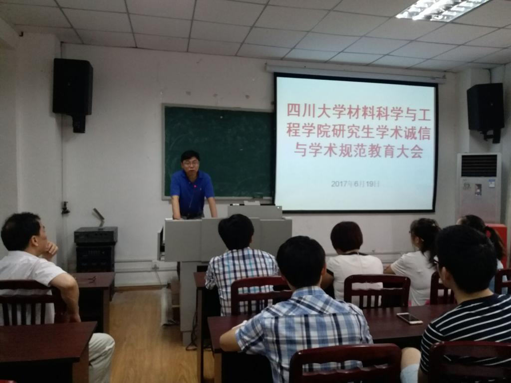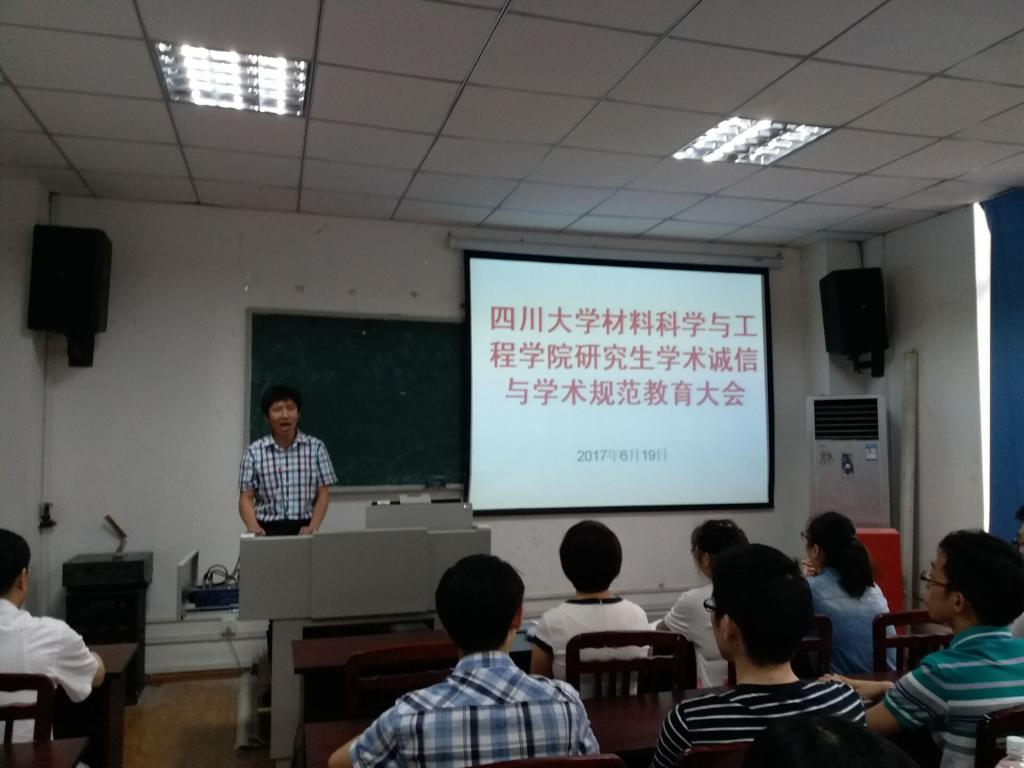 2017年6月19日,德赢官网举行研究生学术诚信与学术规范教育大会。院长刘颖教授、朱建国教授、金材系主任黄维刚教授、金材系党支部书记连利仙教授以及全体金材系研究生参加了大会。大会由院党委副书记唐世红主持。